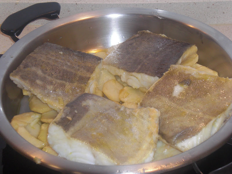 3.- Enharinamos los lomos de bacalao, los sellamos en el aceite que hemos utilizado para freír las patatas, inicialmente con la piel hacia abajo, y los situamos posteriormente sobre nuestras patatitas.