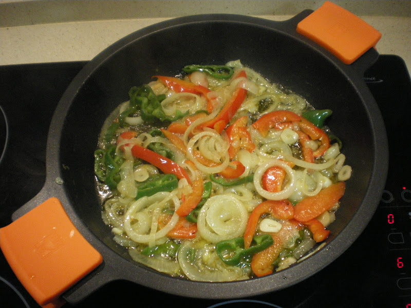 1º.- Comenzamos pelando y cortando las patatas en rodajas de medio centímetro más o menos y dorándolas ligeramente en abundante aceite de oliva virgen extra. Al mismo tiempo, cortamos las cebollas, el pimiento rojo y verde y los ajos en rodajas y pochamos nuestras hortalizas a fuego lento con un poquito de sal y aceite de oliva virgen extra durante unos 5 ó 7 minutos. Posteriormente, añadimos el Vino de Rueda Solera y continuamos salteando nuestros ingredientes hasta que se consuma el alcohol de este sabroso y aromático vino que es un fiel aliado gastronómico en mi humilde cocina de aficionado a estos menesteres.