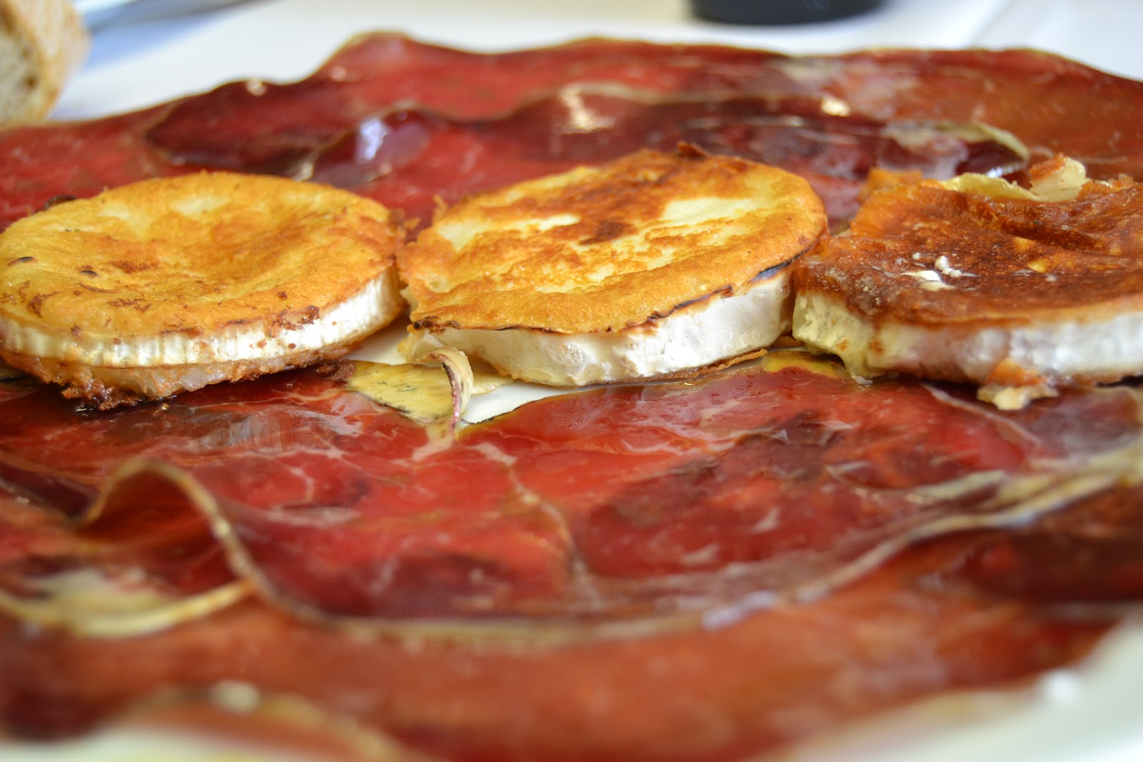 Exquisita cecina con aceite de oliva virgen extra y rulo de queso de cabra a la plancha, sin palabras.