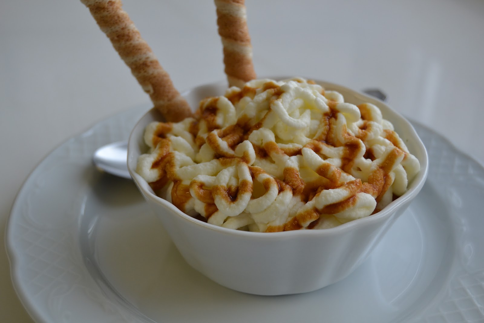 No puede faltar un toque dulce en una agradable comida y Ángeles nos sorprendió con esta deliciosa copa de tarta helada con frutas variadas, nata montada y sirope de caramelo.