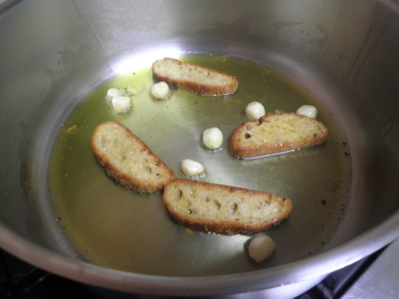 Comenzamos dorando a fuego lento los ajos y el pan en aceite de oliva virgen extra.