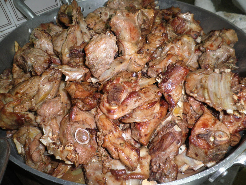 Salpimentar y dorar tantos kilos de carne ha sido una sufrida tarea compartida por mi cuñado Yuyo y por un servidor; ¡eso sí!, no nos ha faltado en ningún momento nuestro buen vaso de vino en la mano o muy cerca de nosotros.