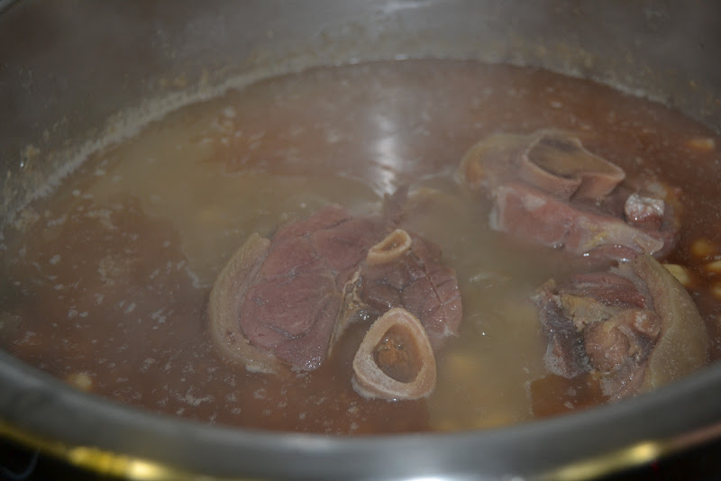 5º.- Troceamos los codillos cuando estén tiernos en pequeños pedazos -¡qué ricos!- y los incorporamos a los garbanzos manteniendo la cocción durante unos minutos más; reservamos.