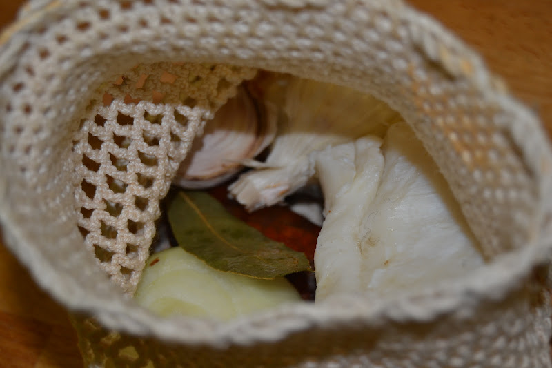 1º.- En el interior de una bolsa con forma de red o malla introducimos un chorizo picante, el trozo de tocino, las dos cebollas, la cabeza de ajos rojos, abundante perejil, una hoja de laurel, una cucharada generosa de cominos, dos o tres clavos o más a vuestro gusto, una cucharadita de nuez moscada y las cinco guindillas.