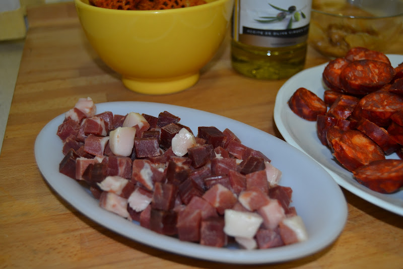 9º.- Ha llegado el momento de incorporar a nuestros ingredientes el sabroso chorizo y el exquisito jamón serrano con su tocinito exterior. Removemos suavemente durante dos minutos y mantenemos nuestra generosa olla a fuego lento; muy lento.. El aroma en la cocina es muy agradable, bueno, ya os lo podéis imaginar; ¿no?….