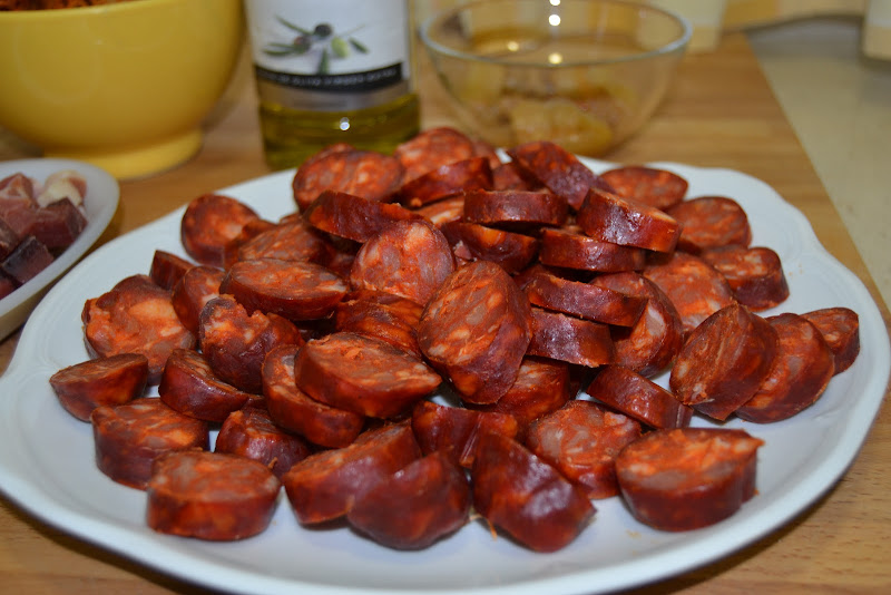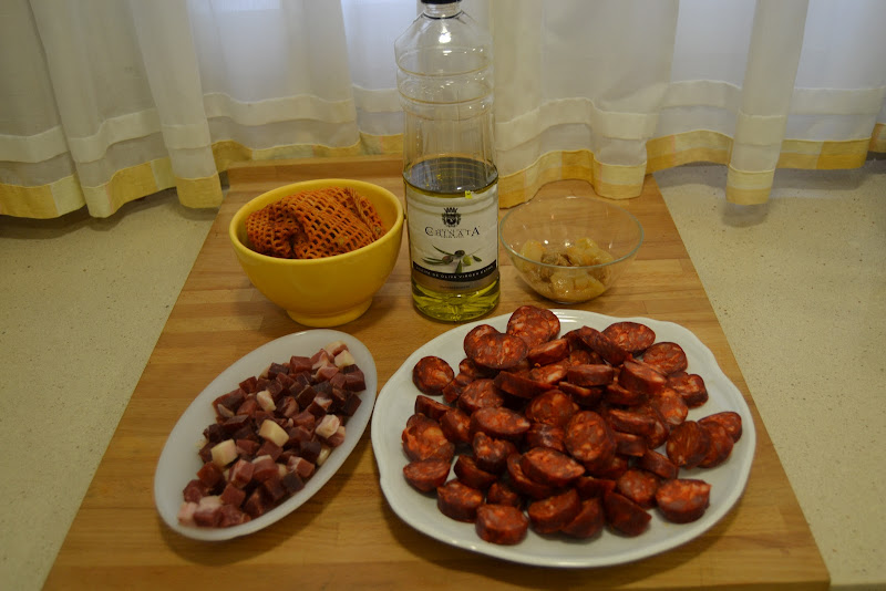 3º.- Salteamos ligeramente en un poquito de aceite de oliva virgen extra las rodajas de chorizo y el jamón durante unos minutos y reservamos.