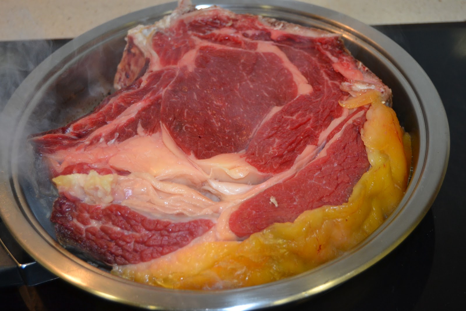 1º.- Precalentamos muy bien en vitrocerámica -posición ó 9– una sartén de acero inoxidable con fondo difusor, untamos generosamente toda la superficie con grasa de vaca y situamos sobre ella el chuletón que previamente hemos retirado del frigorífico con dos horas de antelación como mínimo con la finalidad de que la carne se atempere (muy importante 🙂).