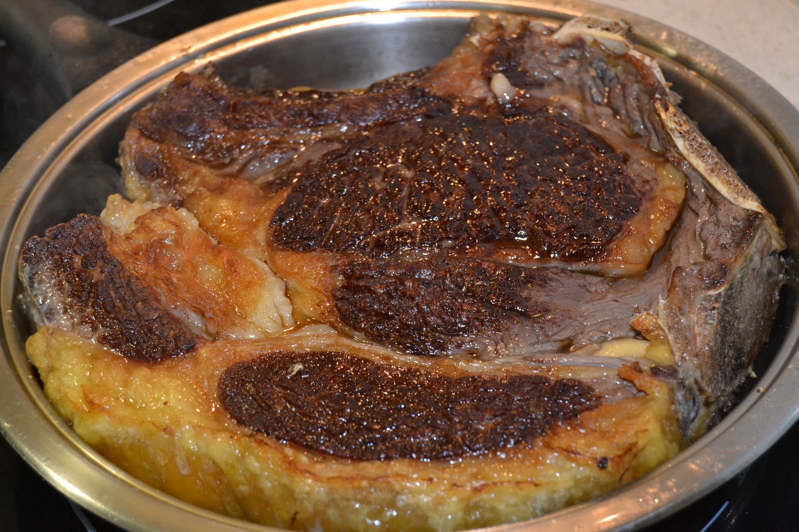 3º.- Le damos la vuelta y mantenemos el chuletón sobre la sartén a fuego fuerte -9 máximo en vitro- durante otros 3 minutos más.