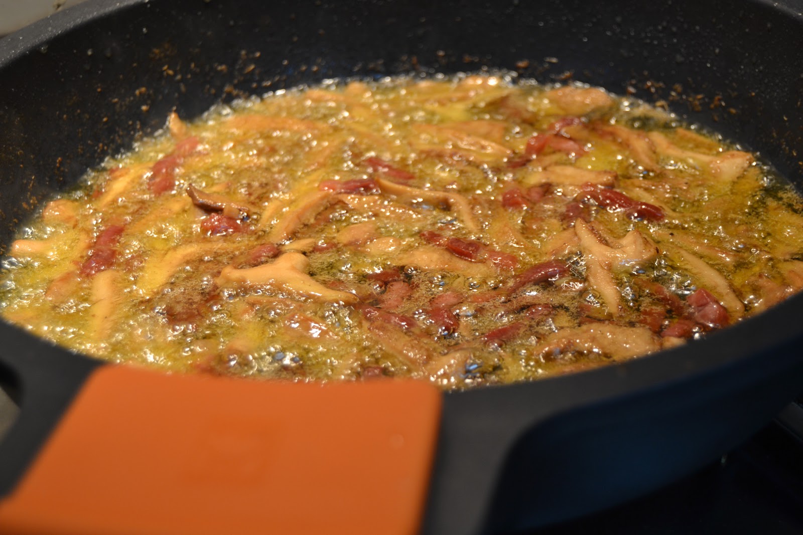 9º.- Salteamos los 200 gramos de Hydnum repandum, incorporamos la panceta y reservamos.