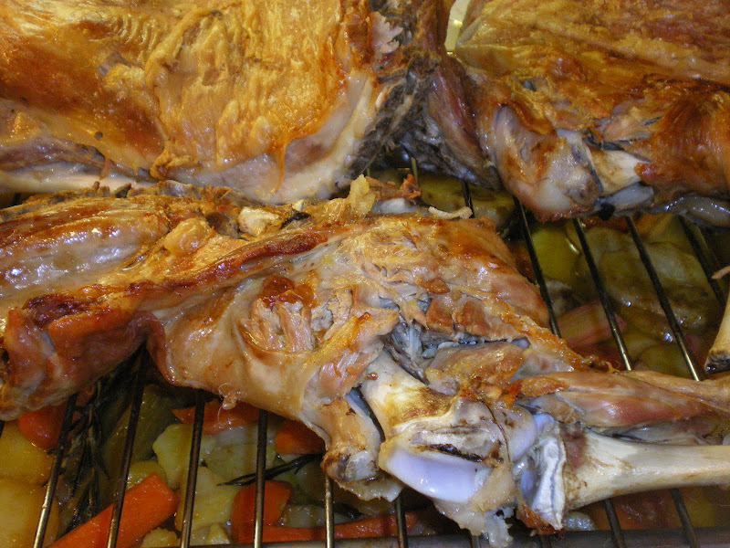 Maravillosa cena, me gusta el toque de azafrán en el fondo de verduras. Además así es una forma cómoda de cocinarlo, con una bandeja recipiente abajo y rejilla de horno para que las carnes reciban el calor sosegado del horno por todas partes. Hay gente que sustituye la rejilla por ramas de laurel apoyadas sobre la bandeja recipiente. Ahí apoyan al lechazo.