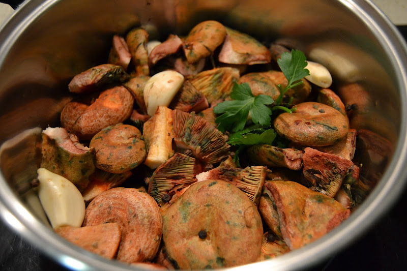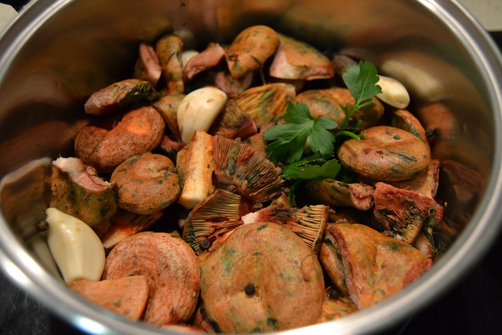 250 gramos de Lactarius sanguifluus previamente confitados en aceite de oliva virgen extra.