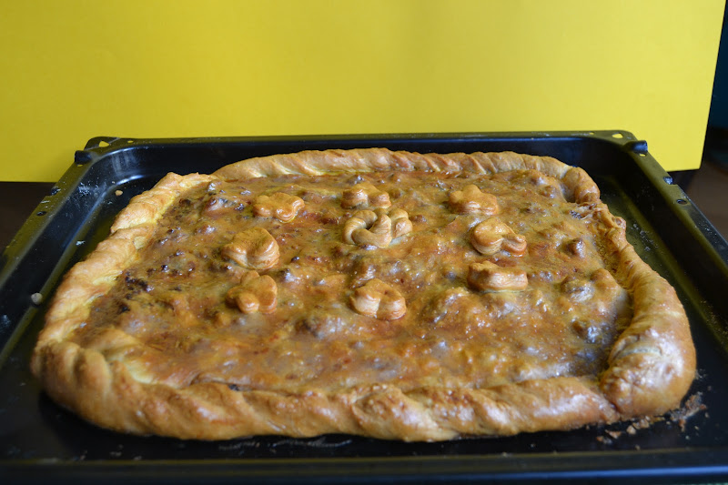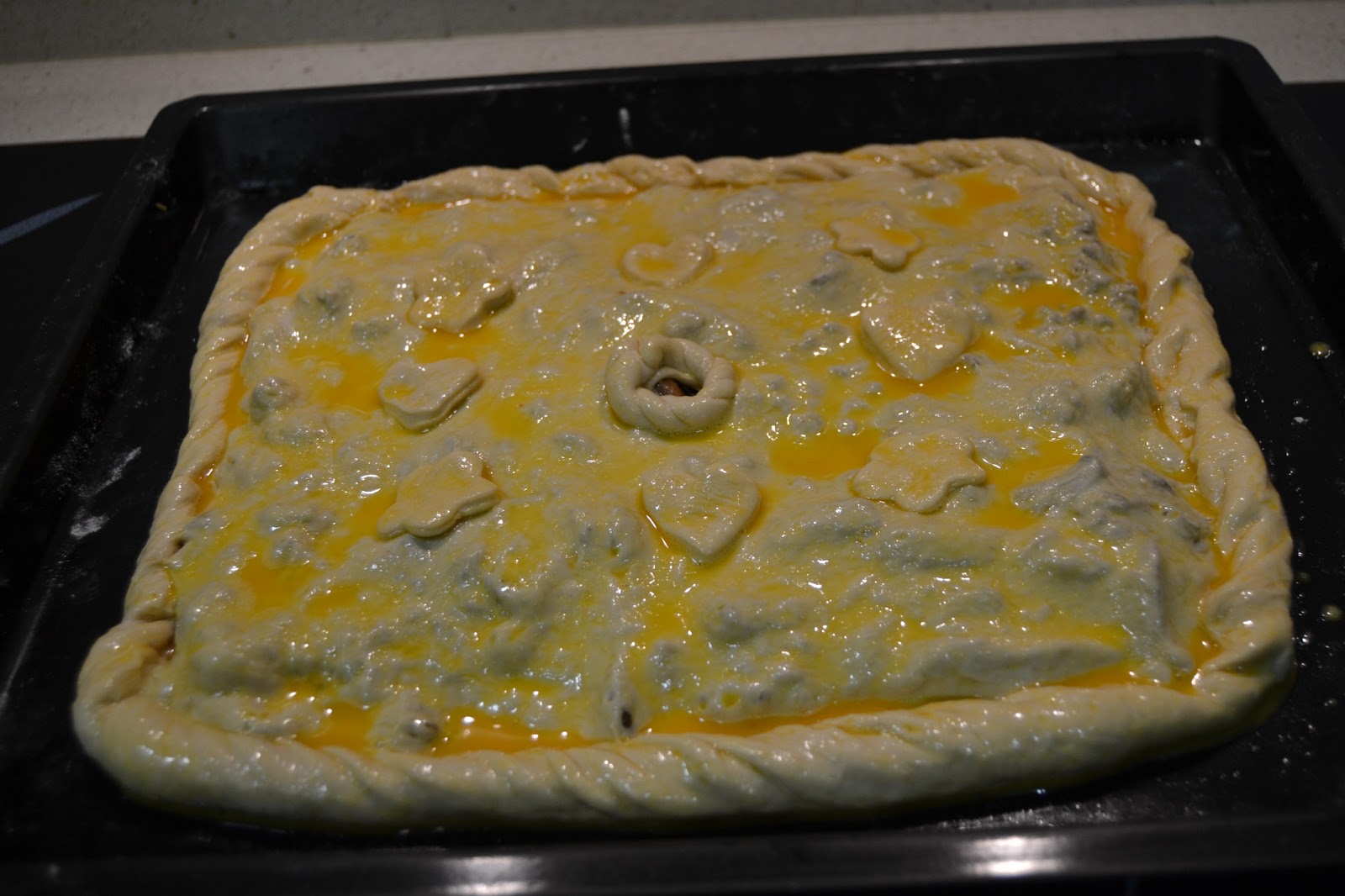 10º.- Extendemos con el rodillo la porción de masa más pequeña hasta que quede fina y procedemos a cubrir la empanada rematando los bordes como podéis observar en la fotografía superior. Dejaremos un orificio en el centro y decoramos la empanada a nuestro gusto con la masa sobrante.