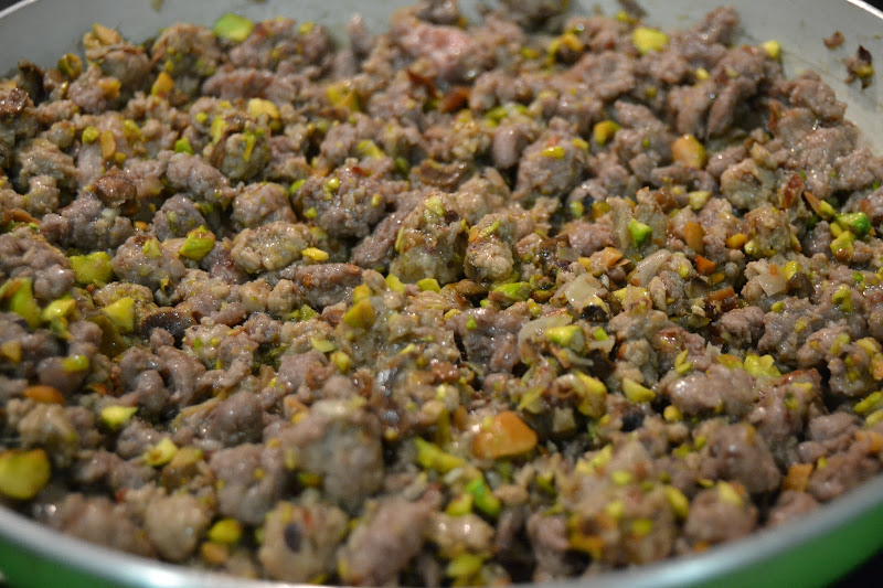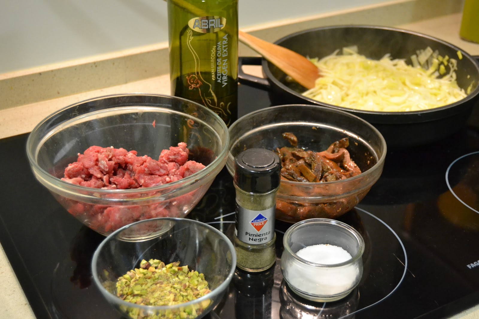 5º.- Incorporamos los pistachos troceados a la carne, un poquito de sal y pimienta negra y salteamos durante un par de minutos nuestros ingredientes y reservamos.