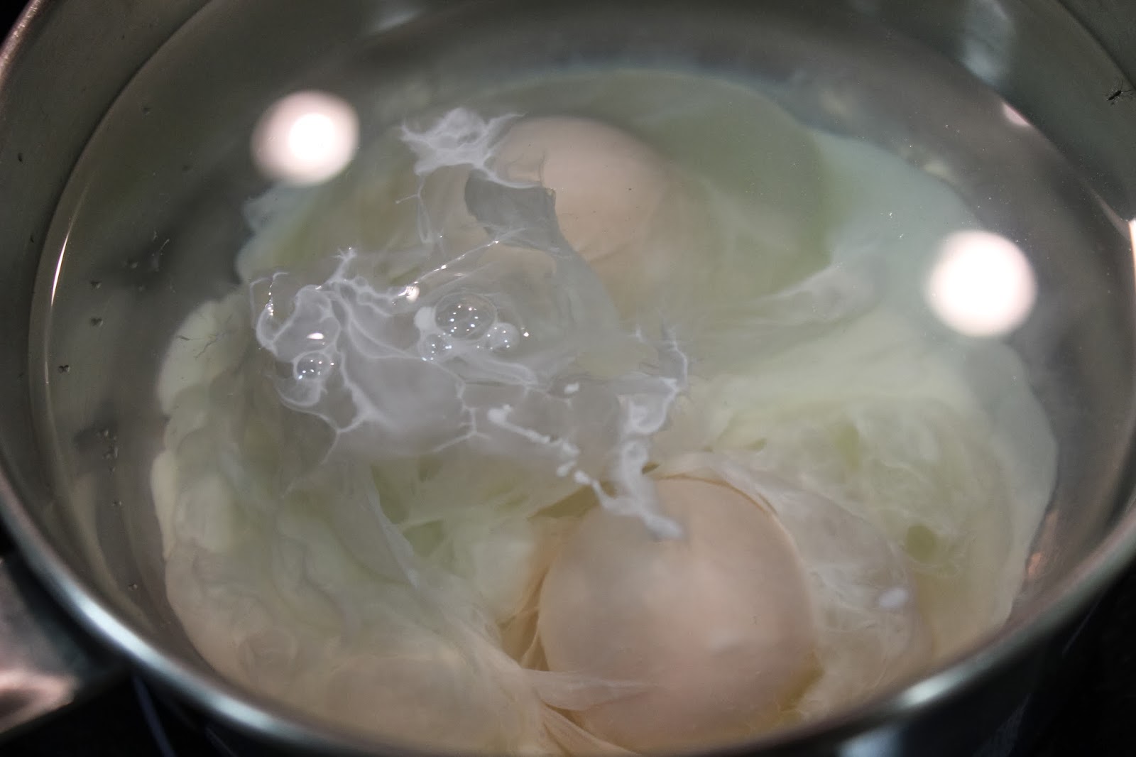 4º.- Escalfamos los dos huevos deslizándolos con cuidado hacia el agua caliente donde permanecerán por espacio de un minuto (1) aproximadamente.