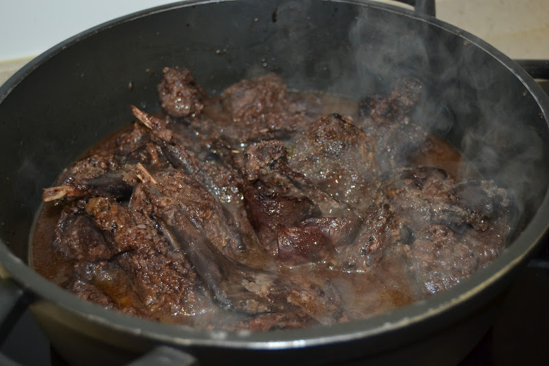 9º.- Añadimos el vino tinto y a continuación elevamos a potencia máxima el fuego durante unos 5 minutos. A continuación, incorporamos el sabroso caldo -un vaso generoso- que habíamos preparado con los dos huesos de caña y removemos durante unos segundos.