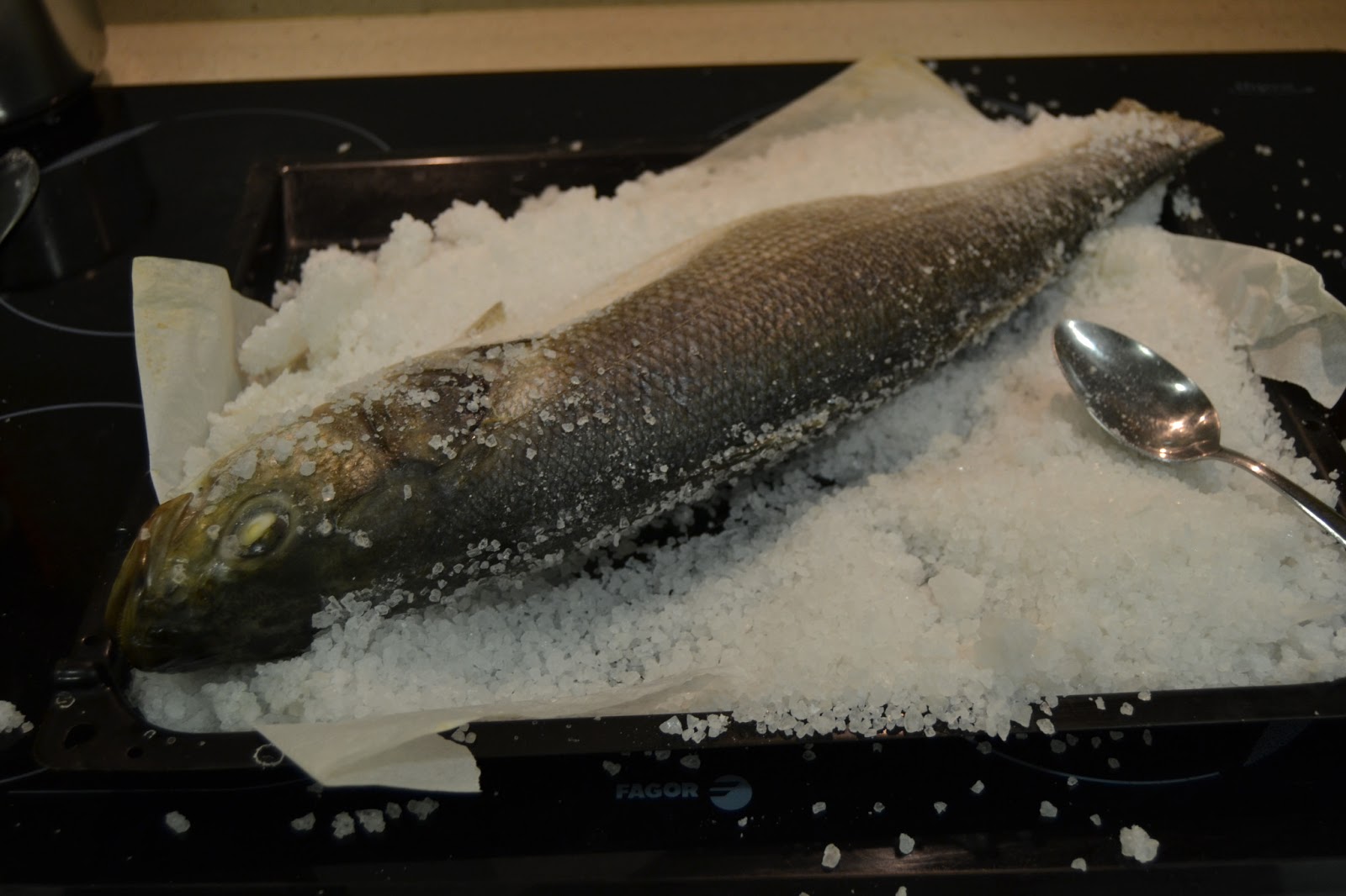 2º.- Para esta pieza necesitamos aproximadamente 2 kilos de sal gruesa especial para horneados aunque que yo os recomendaría que la mezclarais con un poco de sal fina o entrefina para que os resultara más fácil cubrir a la lubina.