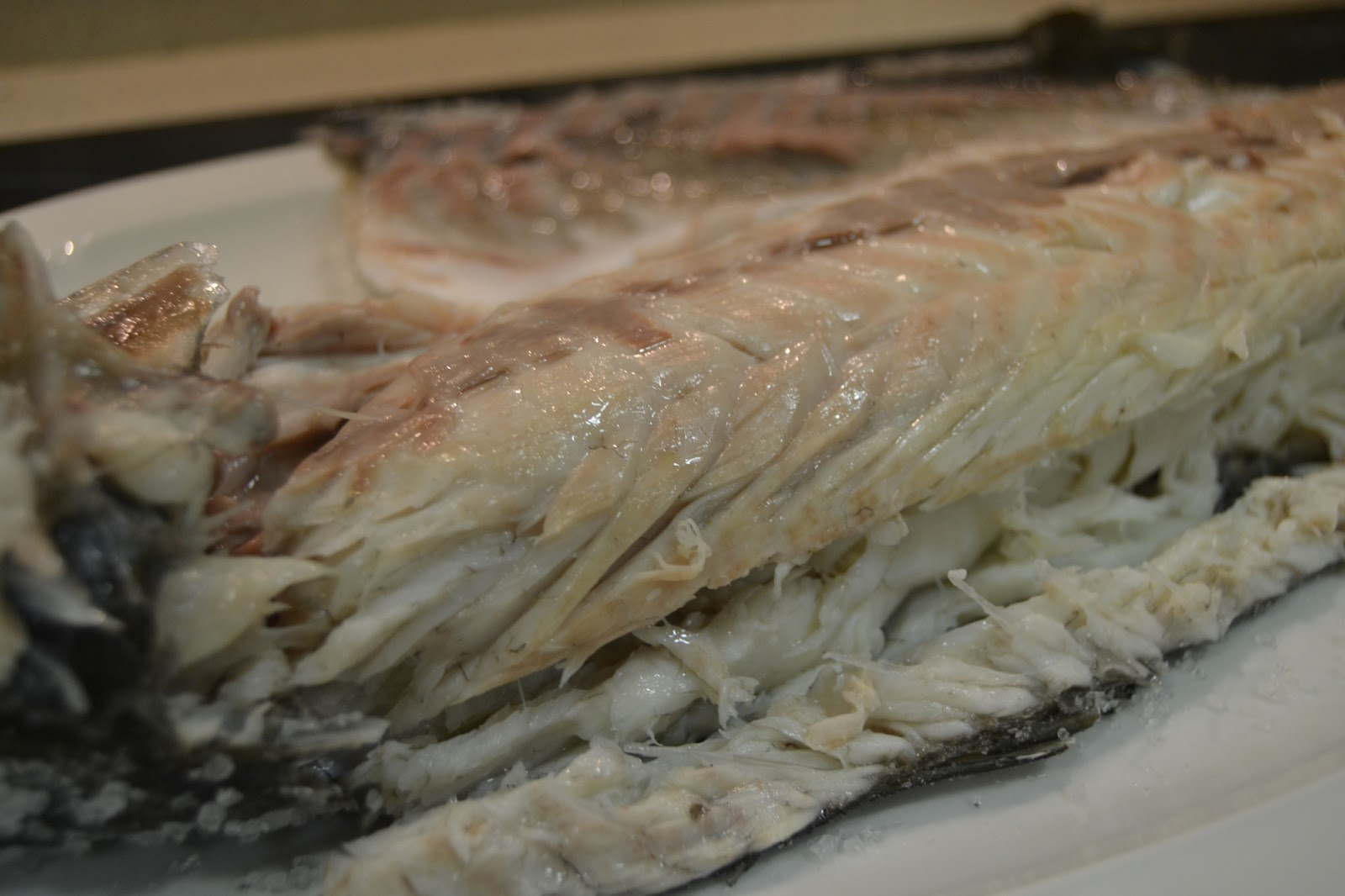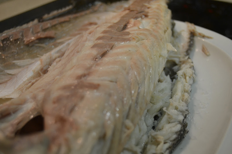 7º.- Escurrimos la lubina sobre la rejilla y la trasladamos a nuestra fuente para comenzar a retirarle la piel con cuidado con las manos, se desprendió sin dificultad alguna y el resultado fue excelente.