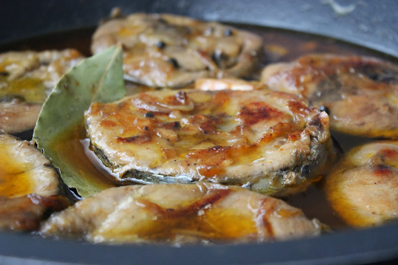 8º.- Situamos las rodajas de melva en la cazuela con una hoja de laurel, subimos la temperatura del fuego y cocemos este exquisito pescado a fuego lento durante 10 minutos.