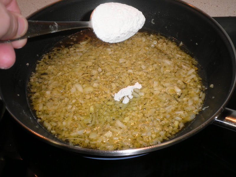 4.- Antes de que la cebolla se dore, incorporamos la cucharada de harina y rehogamos durante unos minutos. Opcionalmente podéis añadir como en esta ocasión, medio vasito de vino de Rueda Solera.