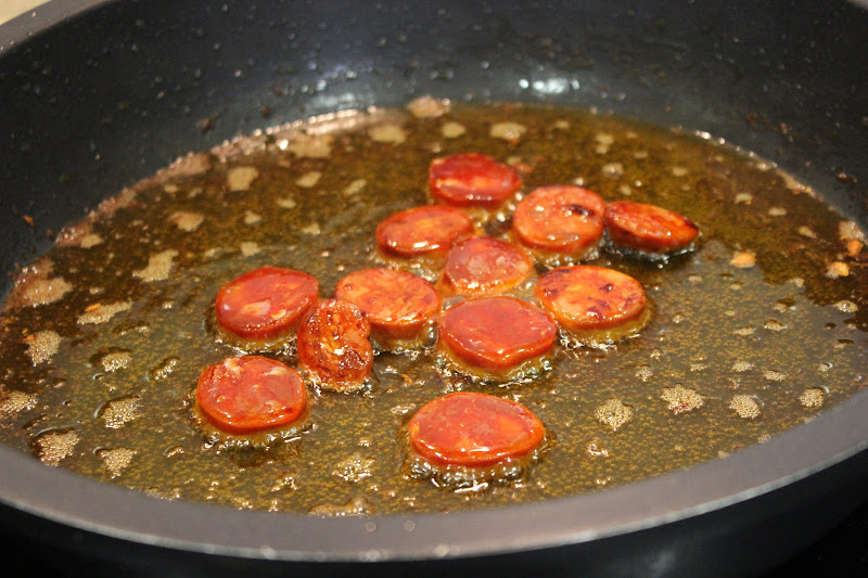 11º.- Incorporamos las rodajas de chorizo y las doramos a fuego medio-7 en vitro- durante unos minutos y las reservamos.