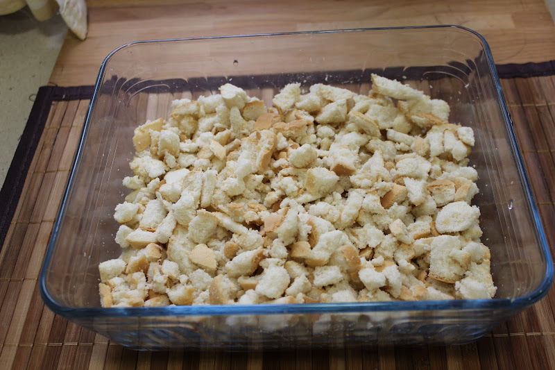 2º.- Comenzamos cortando la barra de pan con un cuchillo de sierra o panadero con cortes en cruz -horizontales y verticales- y posteriormente transversales en pequeños cuadrados y las vamos situando en una fuente.
