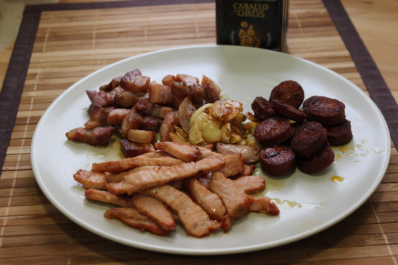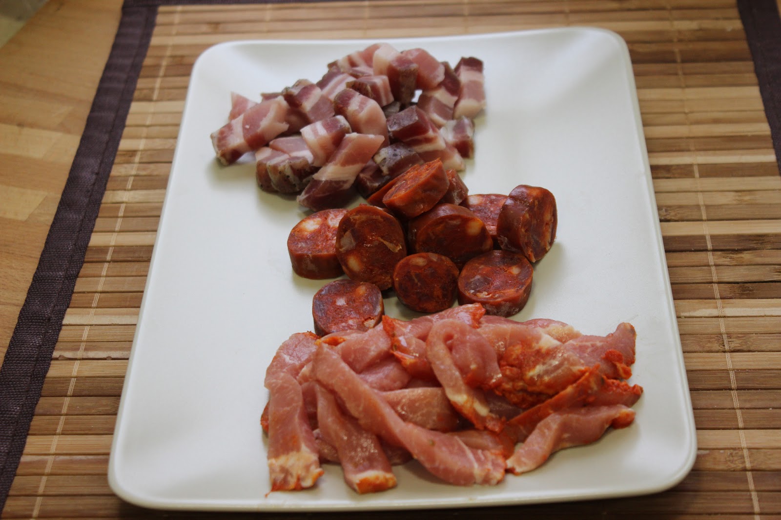 6º.- Cortamos la cinta de lomo ibérica en tiras, la panceta en trozos no excesivamente pequeños y el chorizo en rodajas y reservamos.