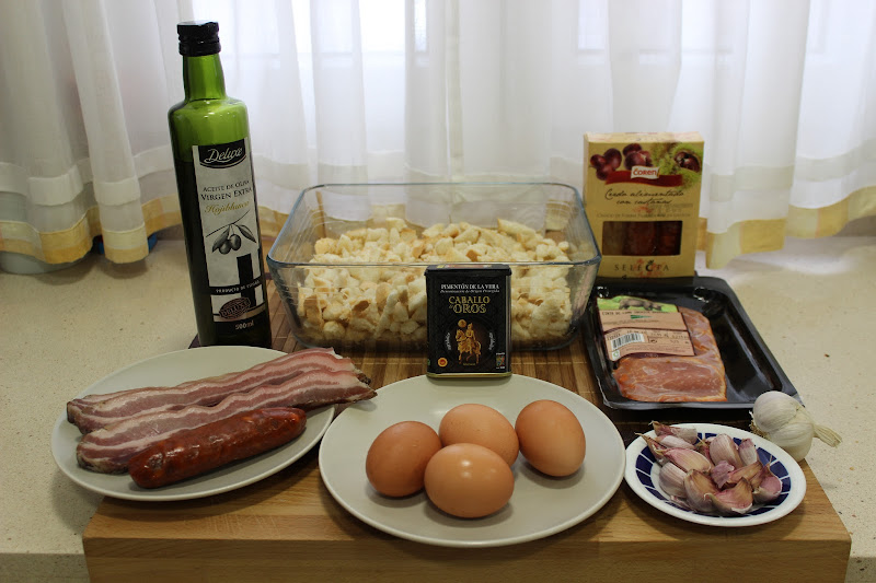 Como curiosidad te comento que en Badajoz no llevan pimentón y sin embargo suelen incluir unas tiras de pimiento rojo frito al mismo tiempo que los ajos que suelen ser enteros con piel.