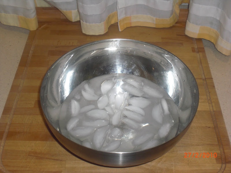 2.- Tal como podéis ver en las fotografías superiores, introducimos el bol dentro de otro bol, de manera que el fondo permanezca en contacto con el agua fría a la que hemos añadido trozos de hielo y comenzamos a batir enérgicamente a mano. El objetivo es batir mientras la mezcla baja de temperatura.