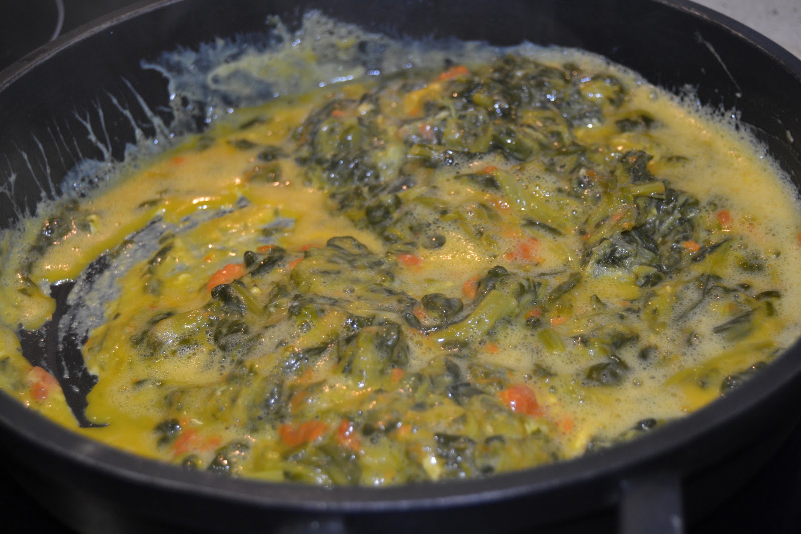 4º.- Batimos muy bien 4 huevos caseros y los incorporamos a nuestros ingredientes removiendo constantemente a fuego lento hasta conseguir el punto a nuestro gusto.