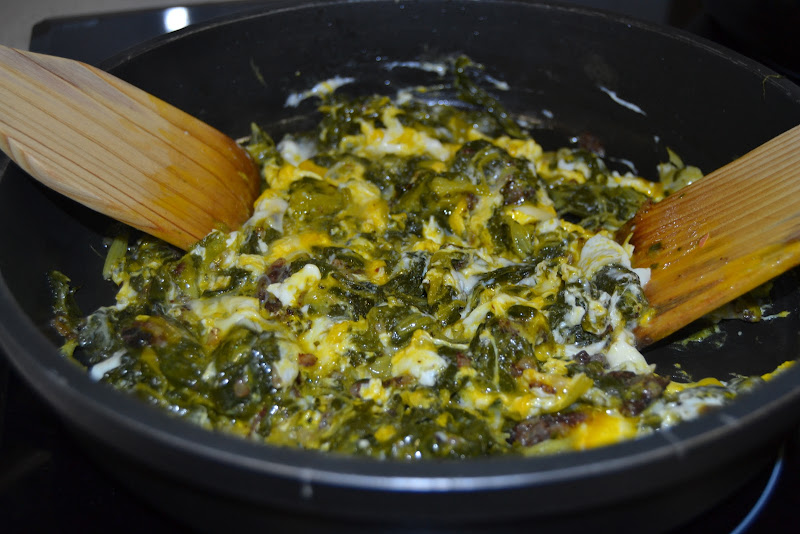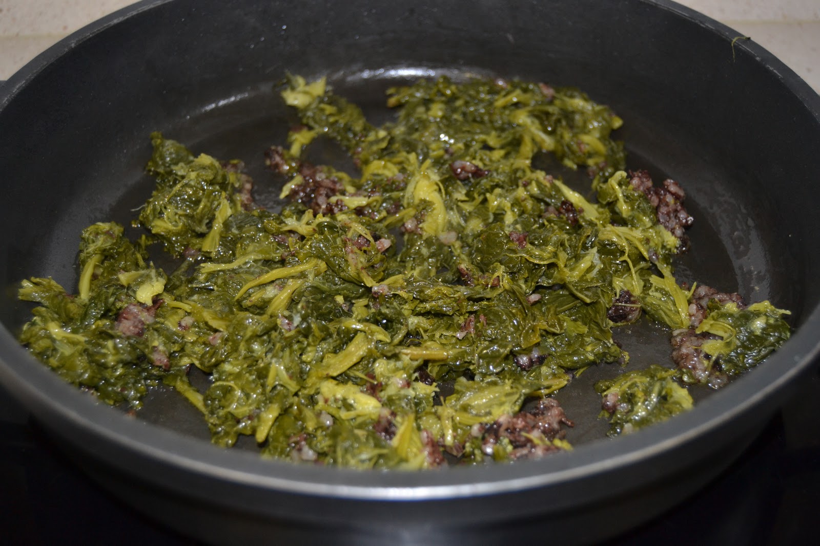 3º.- Incorporamos los 300 gramos sobrantes de grelos de Monfero muy bien escurridos y salteamos durante un minuto nada más.