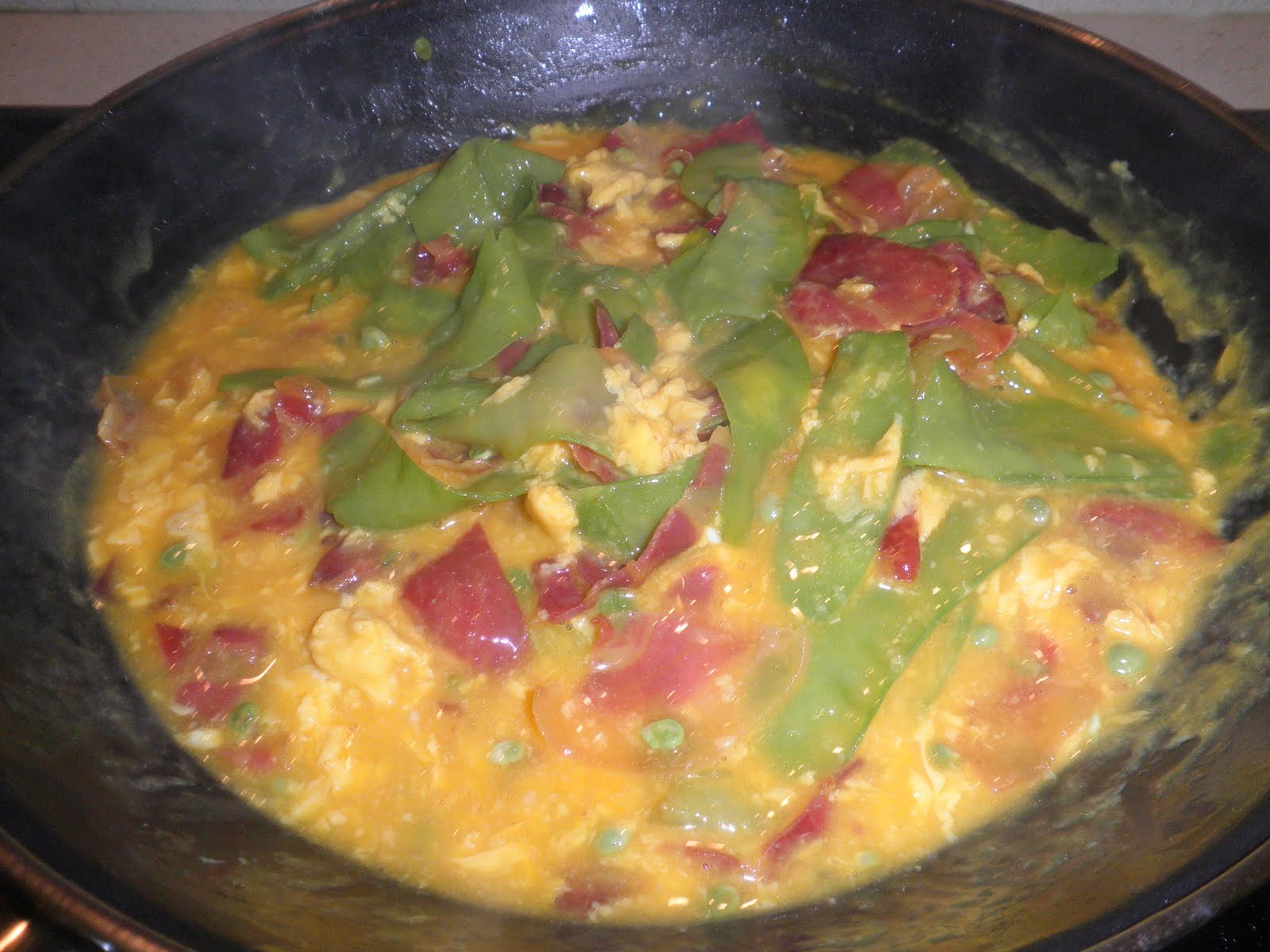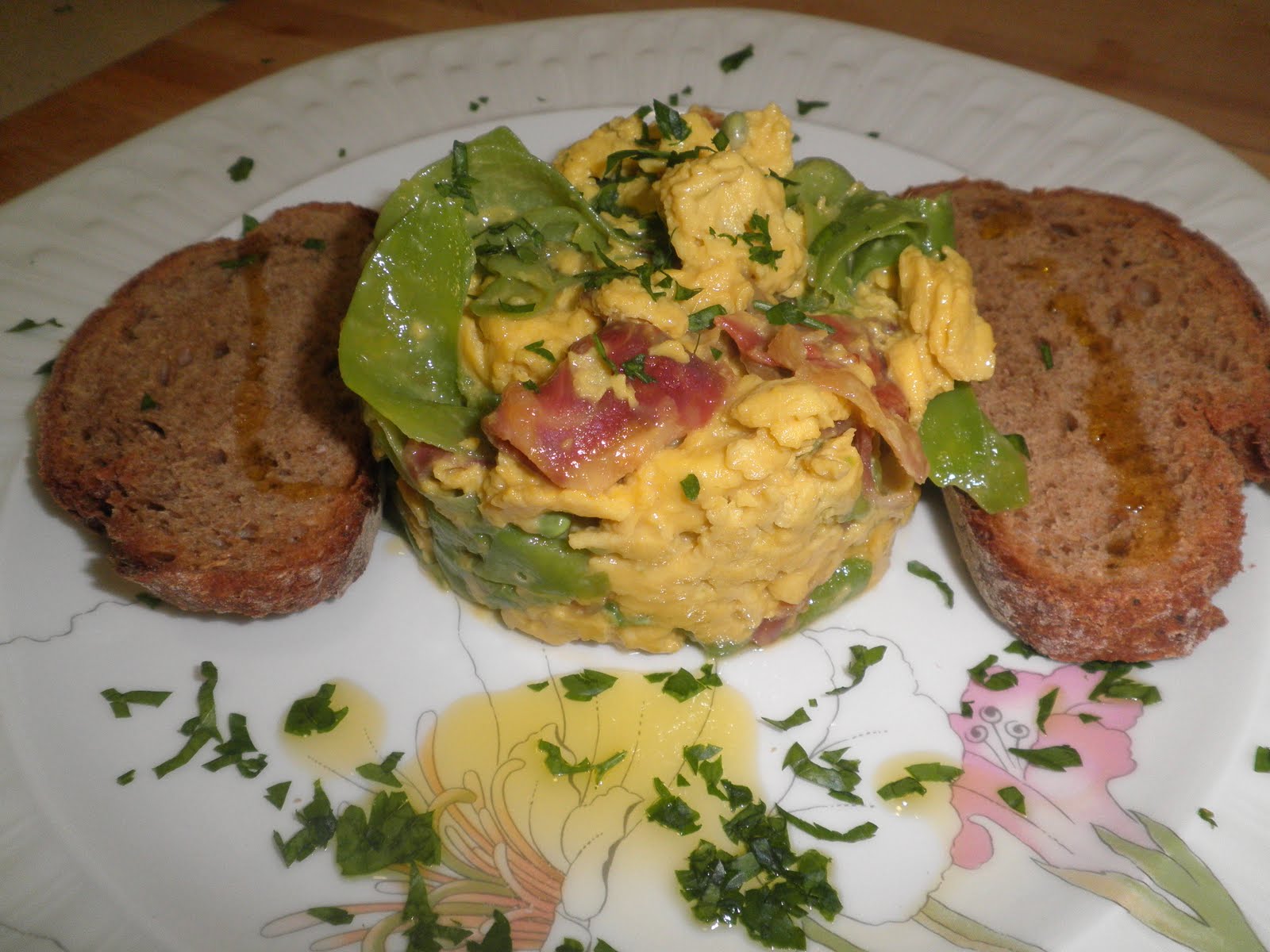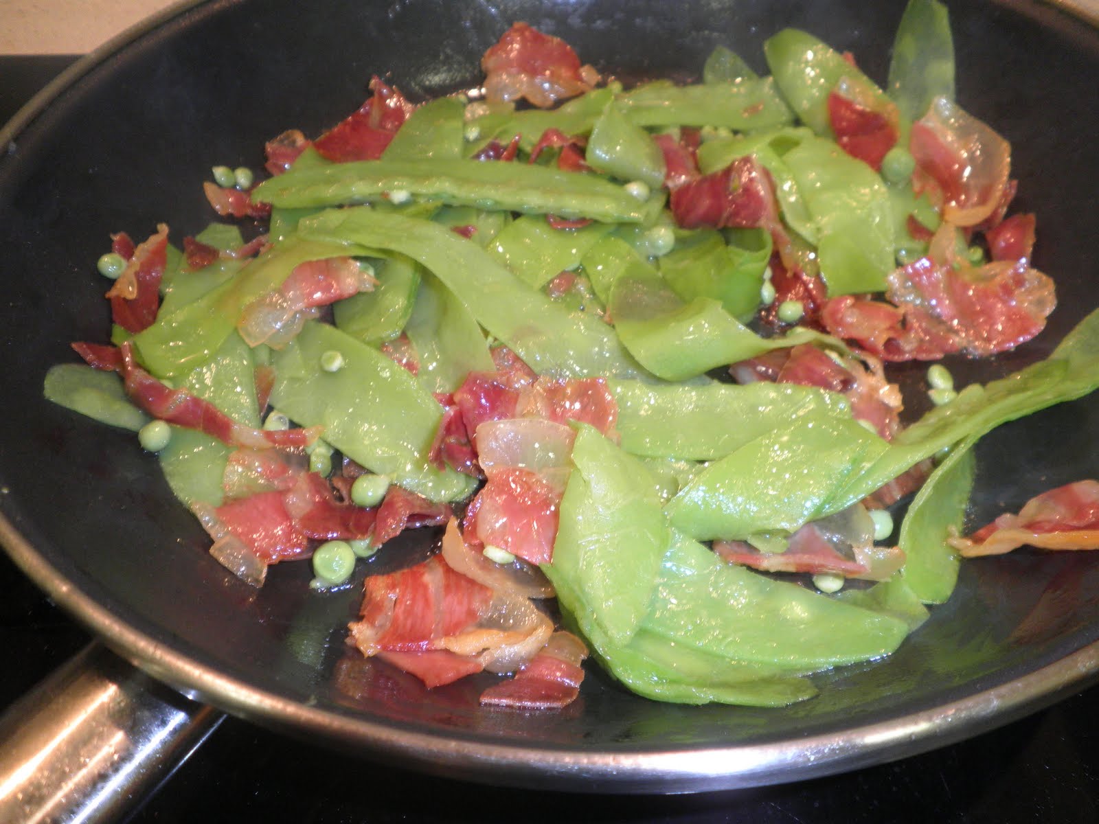 Por la noche, María y yo preparamos para cenar un revuelto de tirabeques con panceta y cuatro huevos caseros. El revuelto de tirabeques estaba tan delicioso que hoy lo hemos preparado nuevamente para comer como entrante con jamón ibérico.