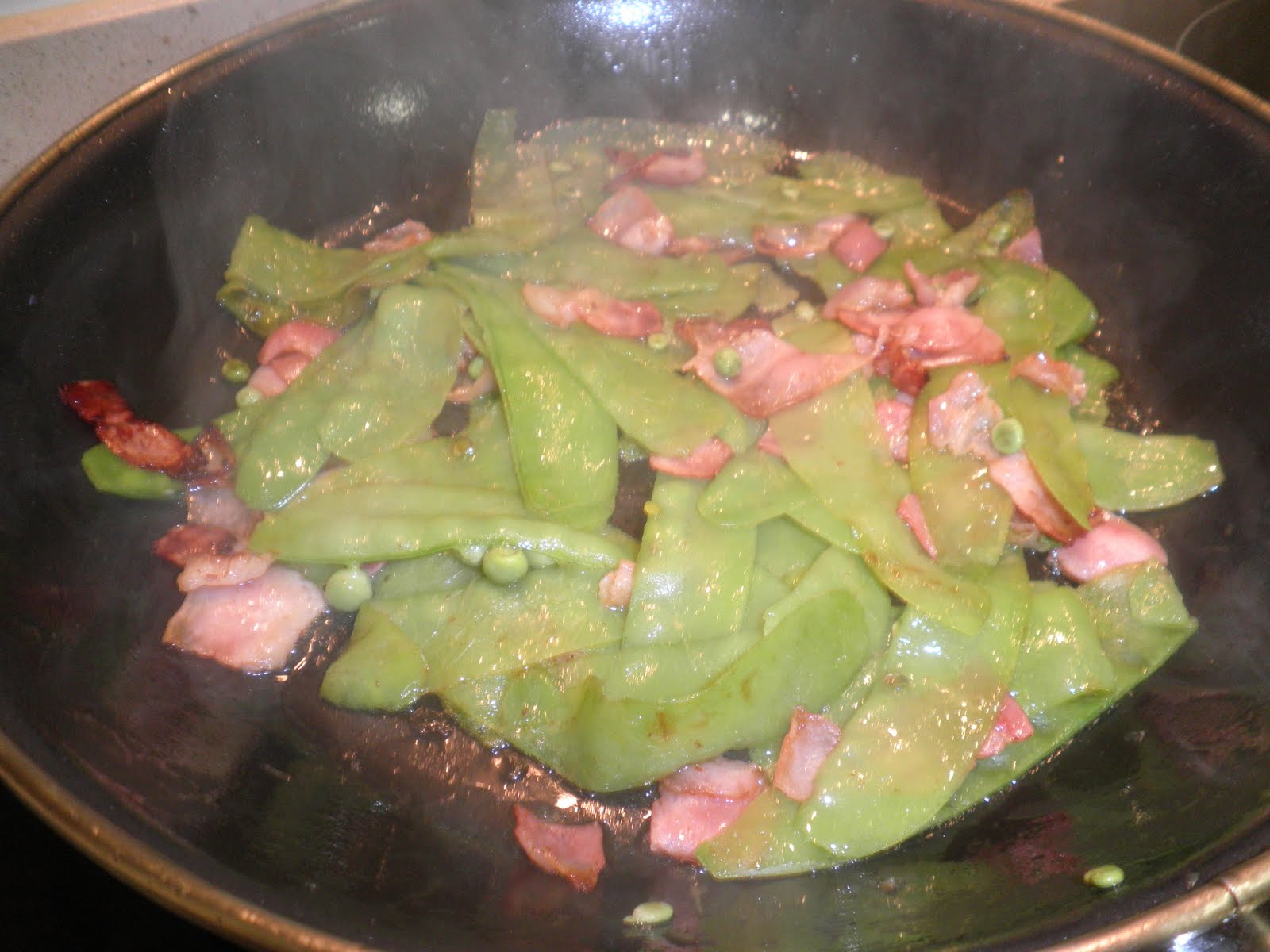 2º.- En una sartén amplia, añadimos el aceite de oliva y salteamos ligeramente la panceta o el jamón ibérico–a vuestro gusto–durante un minuto. A continuación, incorporamos los tirabeques que hemos secado previamente con papel de cocina y salteamos nuestros ingredientes durante un par de minutos más.