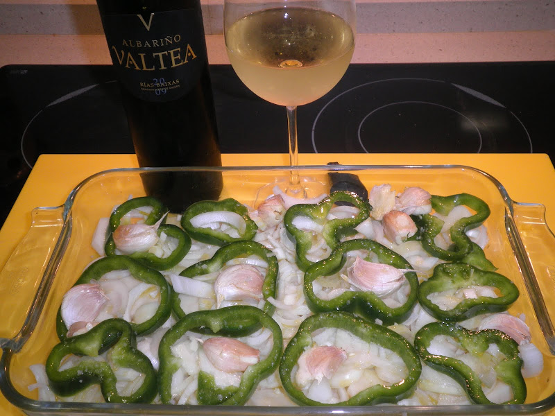3º.- Menos literatura y a los hechos me remito. Comenzamos cortando las patatitas en rodajas de 5 milímetros de grosor y con ellas hacemos una cama en una fuente pírex de horno. Sobre las patatas distribuimos las rodajas de pimiento verde y 10 ó 12 ajos rojos que previamente hemos machacado con la mano o auxiliándonos de un cuchillo cebollero de cocina.4º.- Añadimos sobre nuestros ingredientes un poco de sal gruesa, 7 cucharadas de un buen aceite de oliva virgen extra y una generosa copa de vino Albariño Valtea.