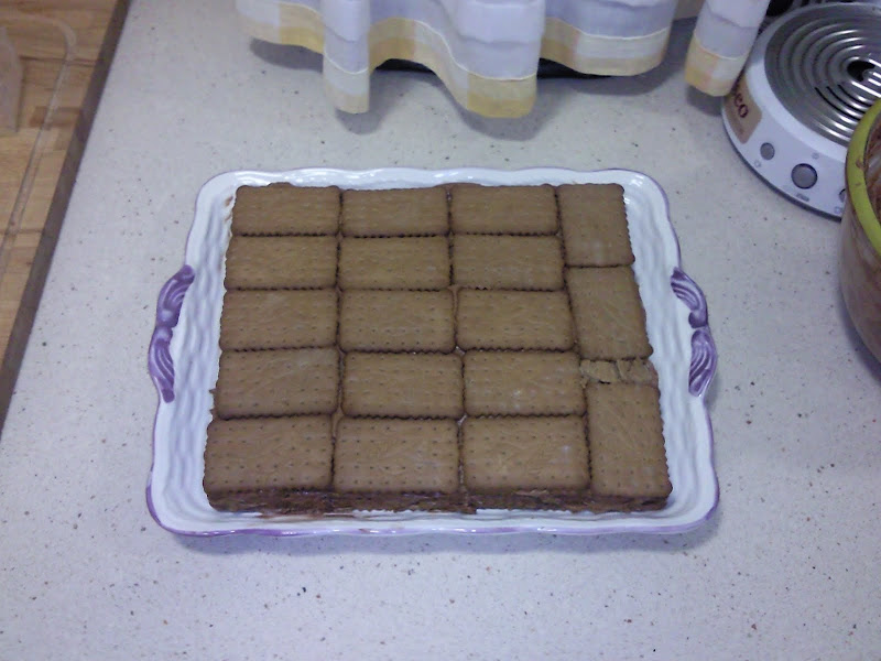 Sexto.- Comenzamos a mojar nuestras galletas en leche mezclada con un poquito de Brandy y las vamos situando en una fuente rectangular.
