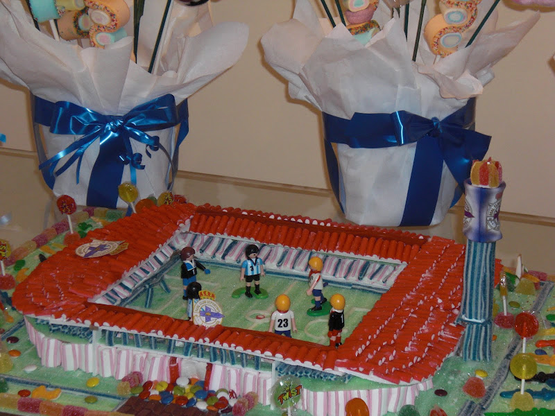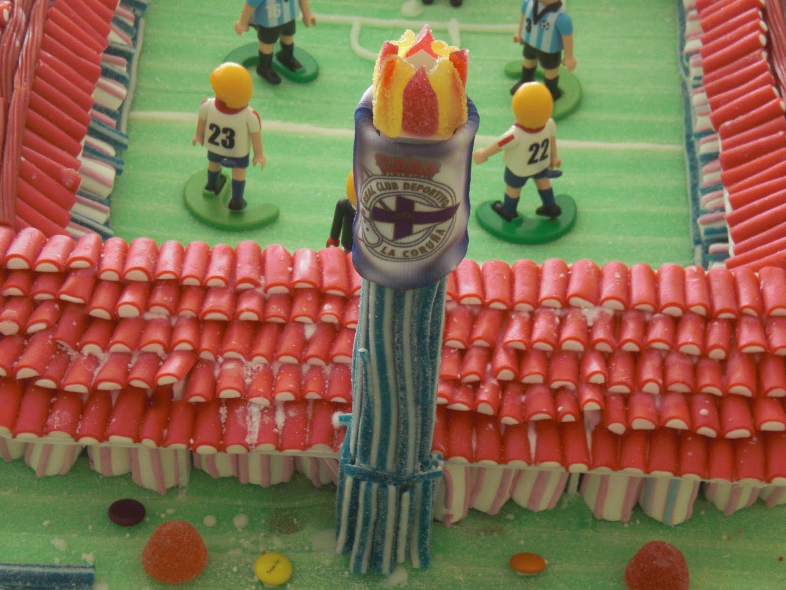 La construcción de este dulce estadio-sorpresa para mis queridos sobrinos Antón y Yago, con motivo de la celebración de su Primera Comunión, en la Iglesia de Santo Domingo en la Ciudad Vieja de A Coruña el pasado domingo 9 de mayo, ha sido posible gracias a Alex–estudiante de arquitectura en la UDC— que ha diseñado y nos ha construido a escala el estadio de Riazor (A Coruña), a Mayte su madre, a Ángeles, María y Lita.